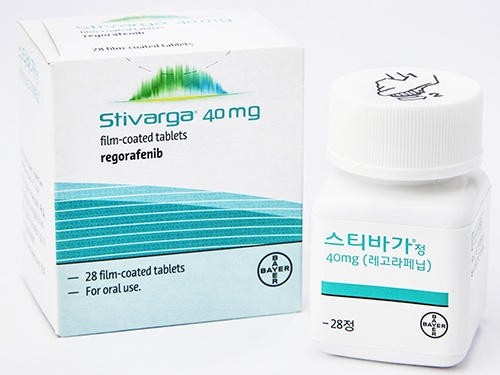 스티바가는 바이엘코리아의 경구용 제제로 2013년 8월 전이성 대장암과 직장암 치료제로 국내 승인 받았다. 이후 GIST(위장관 기질종양)을 추가했고, 2017년 7월 간세포암 2차 치료제로 적응증을 확대했다.