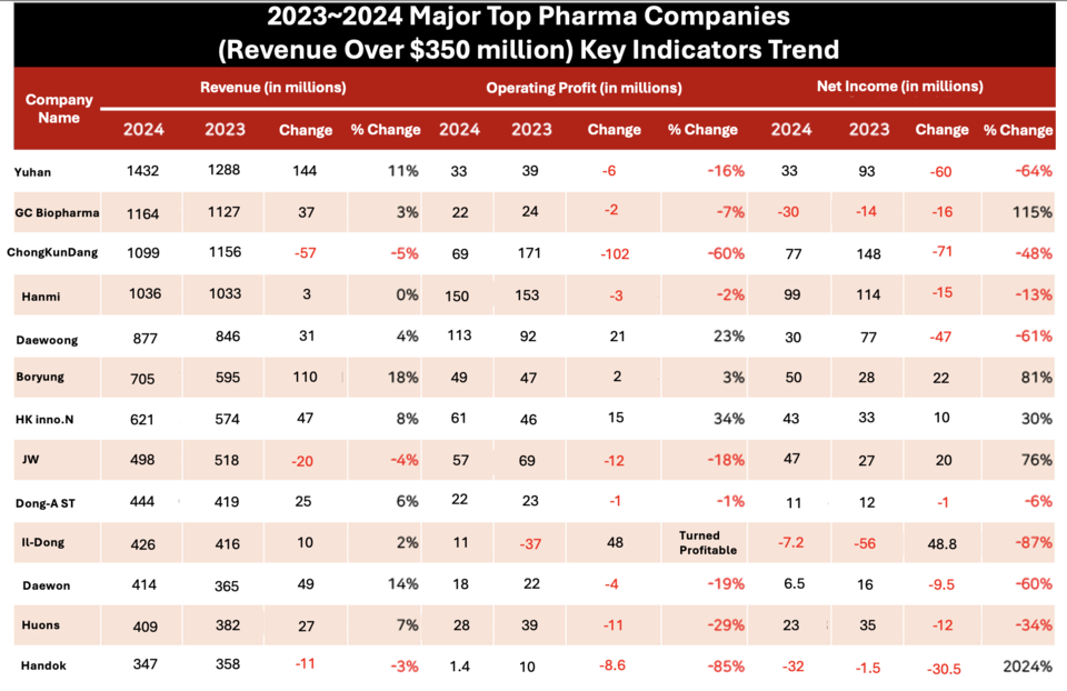 In contrast, ChongKunDang recorded a $102 million decline in operating profit, marking a steep drop. JW Pharmaceutical, Huons, and Handok also faced downturns. Notably, 9 out of the 13 companies analyzed saw a decline in operating profit, reflecting post-COVID growth stagnation and reduced pharmaceutical demand outside specialized fields.