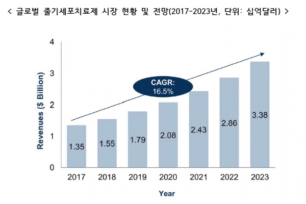 시장조사 분석기관 Frost&Sullivan의 자료를 보면, 전 세계 줄기세포치료제 시장은 2017년 기준 13억 5000달러(1조 5171억원) 규모다. 연평균 약 16.5% 성장해 2023년에는 33억 8000달러(3조 7987억원)의 시장을 형성할 것으로 전망됐다.