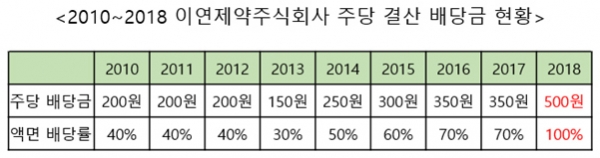 한편, 이연제약은 상장 첫 해인 2010년(200원) 대비 두배 이상 증가한, 보통주 1주당 500원의 현금 배당을 결정했다. 상장 이래 최고 금액으로 이연제약은 유용환 대표 취임 이후 2016년~2017년 350원에서 2018년 500원으로 42.9% 상승했다.