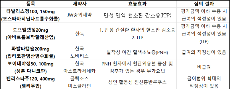 IPT 치료제는 JW중외제약의 만성 면역 혈소판 감소증(ITP) 치료제 '타발리스정100·150㎎(성분 포스타마티닙 나트륨수화물)'과 한독의 '도프텔렛정20㎎(성분 아바트롬보팍말레산염)'이 약평위를 통과했다.
