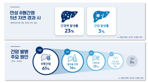 관련 업계에 따르면, B형간염은 △염증 △진행성 간 손상 △만성 간질환 등을 유발하고 이는 간경변과 간암으로 이어져 사망 위험을 높인다. 특히 간암 발병 원인 중 60% 이상이 B형간염으로, 차지하는 비중이 가장 높은 것으로 알려졌다.