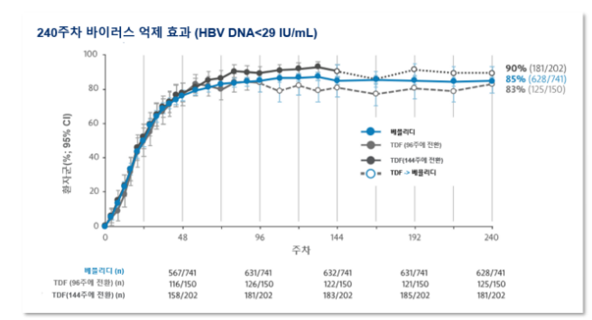 96주 차에 TDF-베믈리디로 전환한 투여군에서는 각각 88.7%·80.4%, 114주 차에 전환한 투여군에서는 96.8%·86.3%가 바이러스 억제에 도달했다.