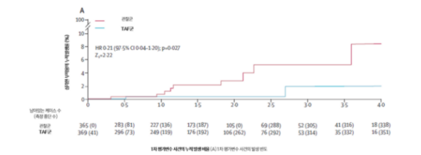 아울러 'ATTENTION' 임상 4년 차 중간 분석에서 TAF 치료군의 간세포암을 포함한 간 관련 사건 발생률은 관찰군 대비 4배 이상 낮았고, 세부적으로는 관찰군에서 간세포암 7건, 사망 및 간 기능 부전 발생이 1건, TAF 치료군에서 간세포암 2건의 사건이 발생했다.