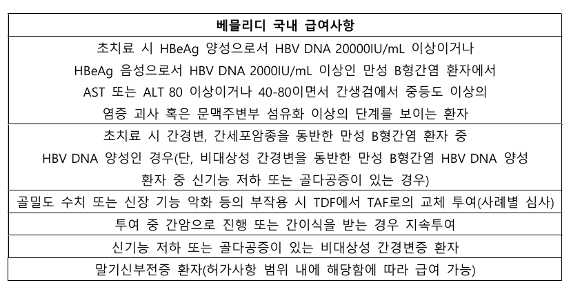 베믈리디는 국내에서 △골밀도 수치 또는 신장 기능 악화 등의 부작용 시 TDF에서 TAF로의 교체 투여 △투여 중 간암으로 진행 또는 간이식을 받는 경우 지속투여 등에 급여가 적용된다.