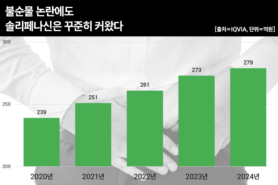 솔리페나신은 무스카린성수용체3(M3)에 신경전달물질인 아세틸콜린이 결합하는 것을 차단해 방광 수축을 억제하는 기전을 통해 요실금 등을 치료하는 제제다. 의약품 시장조사기관 아이큐비아 기준 2024년 유통액은 279억원으로 최근 5년간 꾸준히 매출이 상승하고 있다. 특히 2023년경부터 국산 원료 부족과 불순물 문제, 복합제 등장에도 단일제만으로도 어느 정도 성장세를 유지하고 있기도 하다.