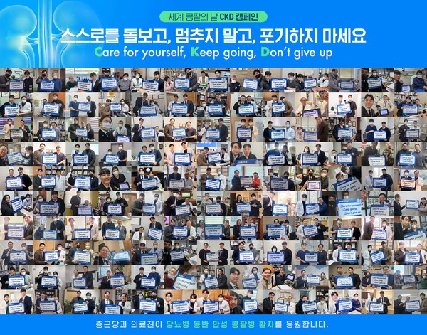 종근당(대표이사 김영주)은 13일 세계 콩팥의 날을 맞이해 전국 의료진들과 함께 만성 콩팥병의 조기 진단 인식을 제고 및 환자들의 관리와 치료를 응원하기 위한 'CKD 캠페인’을 진행했다고 밝혔다.