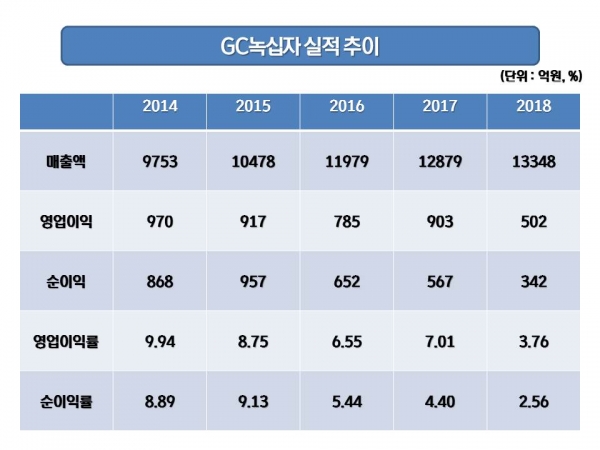 GC녹십자는 12일 2018년도 연결기준으로 1조3349억 원의 매출, 502억 원의 영업이익을 달성했다고 공시했다. 2017년보다 매출은 3.6% 증가했으나 영업이익은 44.5% 줄었다. 당기순이익도 전년 같은 기간보다 39.6% 감소해 342억원에 그쳤다.