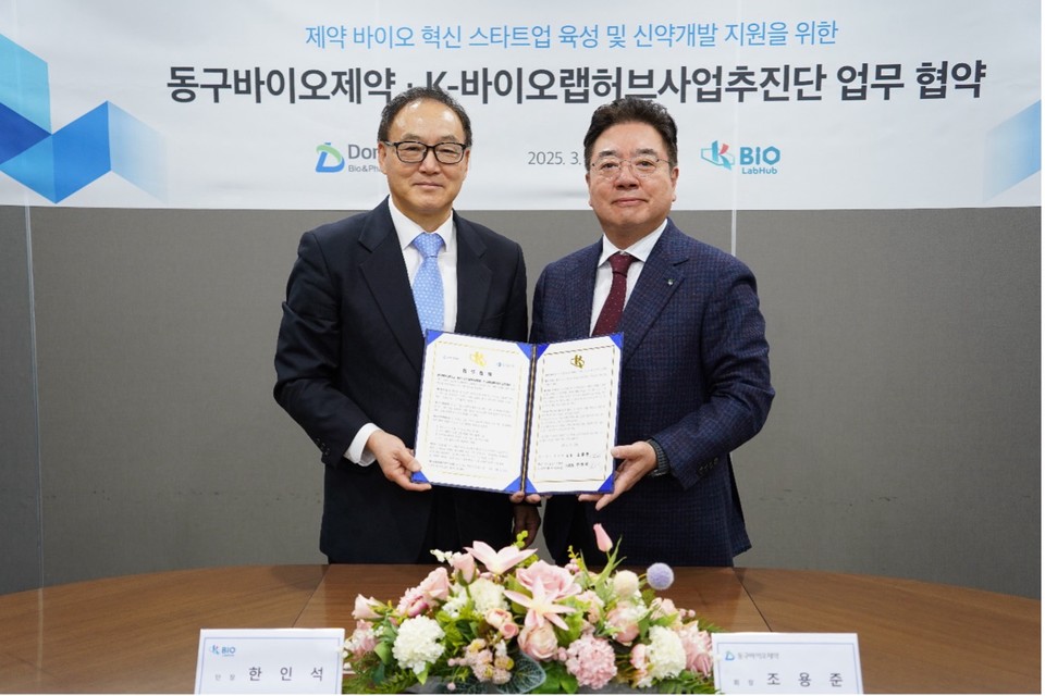 동구바이오제약(회장 조용준)은 28일 본사에서 중소기업기술정보진흥원 K-바이오랩허브사업추진단(단장 한인석)과 바이오 창업기업 발굴 및 육성을 위한 업무협약을 체결했다고 밝혔다.