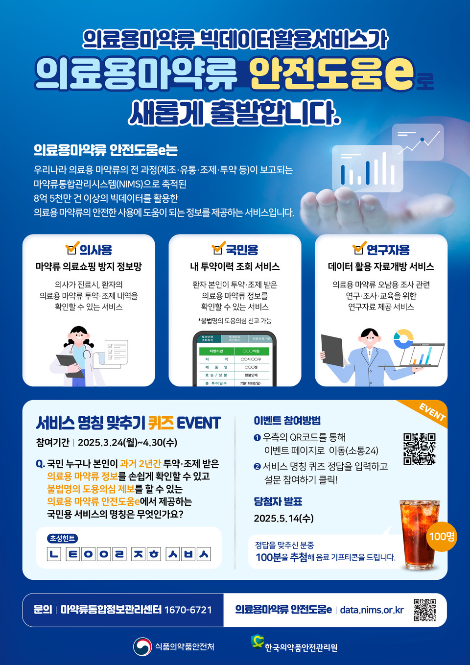 의약품안전원은 "이번 이벤트는 '의료용마약류 안전도움e' 누리집에서 제공하는 서비스 중 하나인 국민용 서비스의 명칭을 맞추는 것"이라고 설명했다.