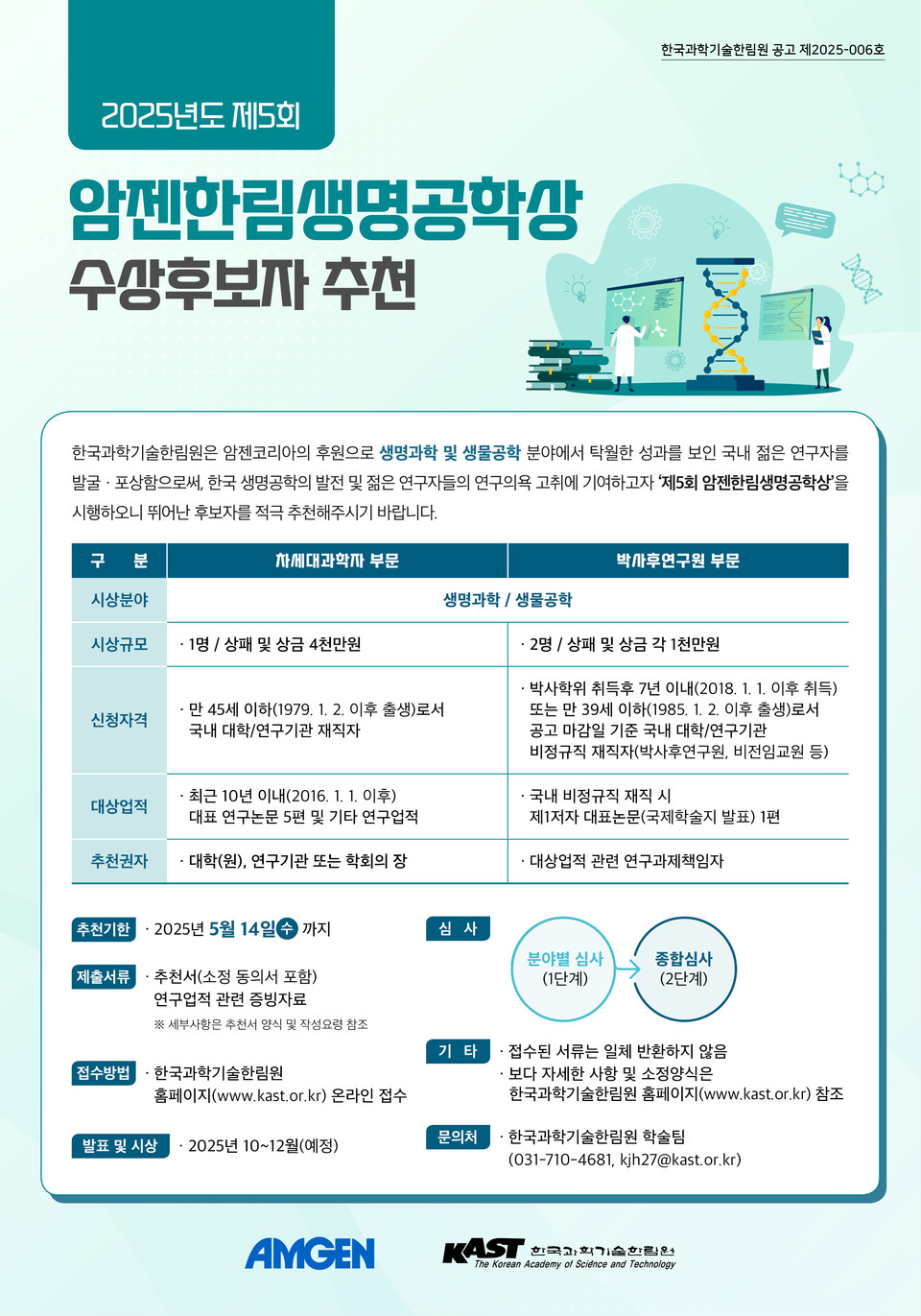 암젠코리아(대표 신수희)는 한국과학기술한림원(원장 정진호)과 함께 오는 5월 14일까지 '제5회 암젠한림생명공학상' 수상 후보자를 공모한다고 3일 밝혔다.