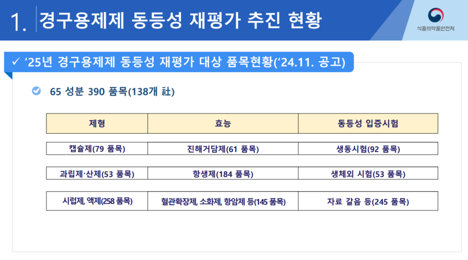식약처가 밝힌 올해 경구용 제제 재평가 대상은 캡슐제, 시럽제·액제 65개 성분, 390개 품목이다. 정 사무관은 "캡슐제, 시럽제·액제 기존에 동등성을 입증한 품목을 제외한 성분이 올해 재평가 대상으로 선정되면서 대상이 다소 늘어났다"고 밝혔다.