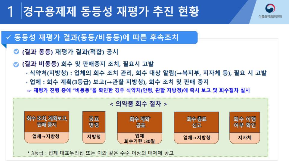 정 사무관은 "결과가 나오는대로 모아서 최종 재평가 결과 공시를 진행할 예정"이라며 "동등한 것으로 판단되면 재평가 결과 공시가 있을 예정이다. 검토 결과 비동등으로 판단되면 재평가 규정에 따라서 회수 등 행정적 조치절차를 거치게 된다"고 밝혔다.