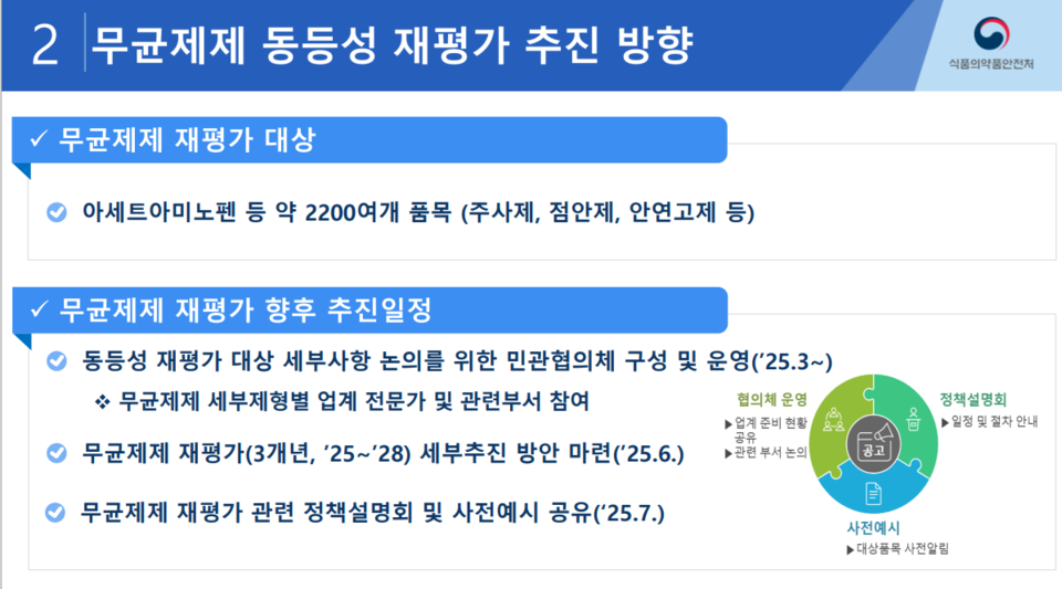 한편 식약처는 무균 재평가 세부사항 논의를 위한 민관협의체를 구성할 예정이다. 관련 정책설명회와 사전 예시 안내는 7월에 개최할 계획이다.
