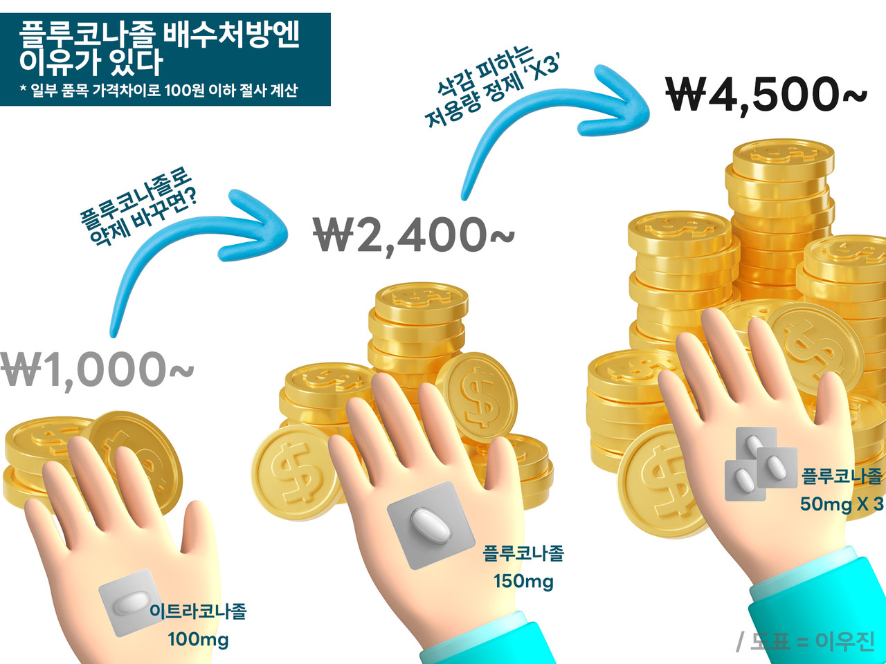 플루코나졸 정제는 150mg와 50mg가 있는데 50mg의 금액이 1510원대이고, 150mg 제품이 2450원대다. 즉 저용량 세 개를 처방해 약 1.8배 수준의 약가를 받는 편법성 영업이 2023년 2월부터 불가능해졌다는 뜻이다.