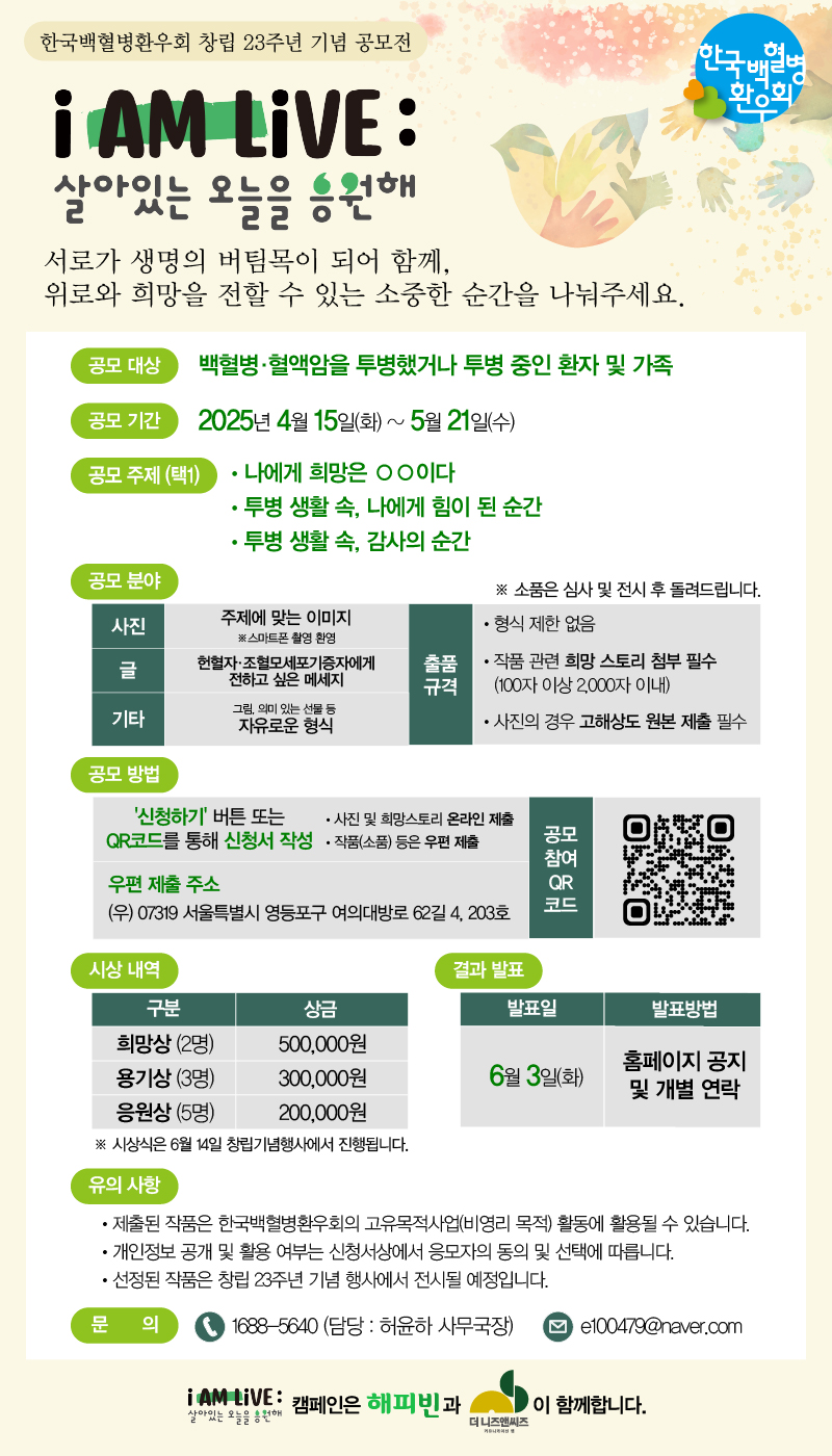 한국백혈병환우회(공동대표 안기종·이은영)는 창립 23주년을 맞아 백혈병·혈액암 환자와 가족이 주체가 돼 삶의 희망과 감사를 나누는 환자 응원 캠페인 'I AM LIVE: 살아있는 오늘을 응원해'를 15일부터 진행한다고 밝혔다.
