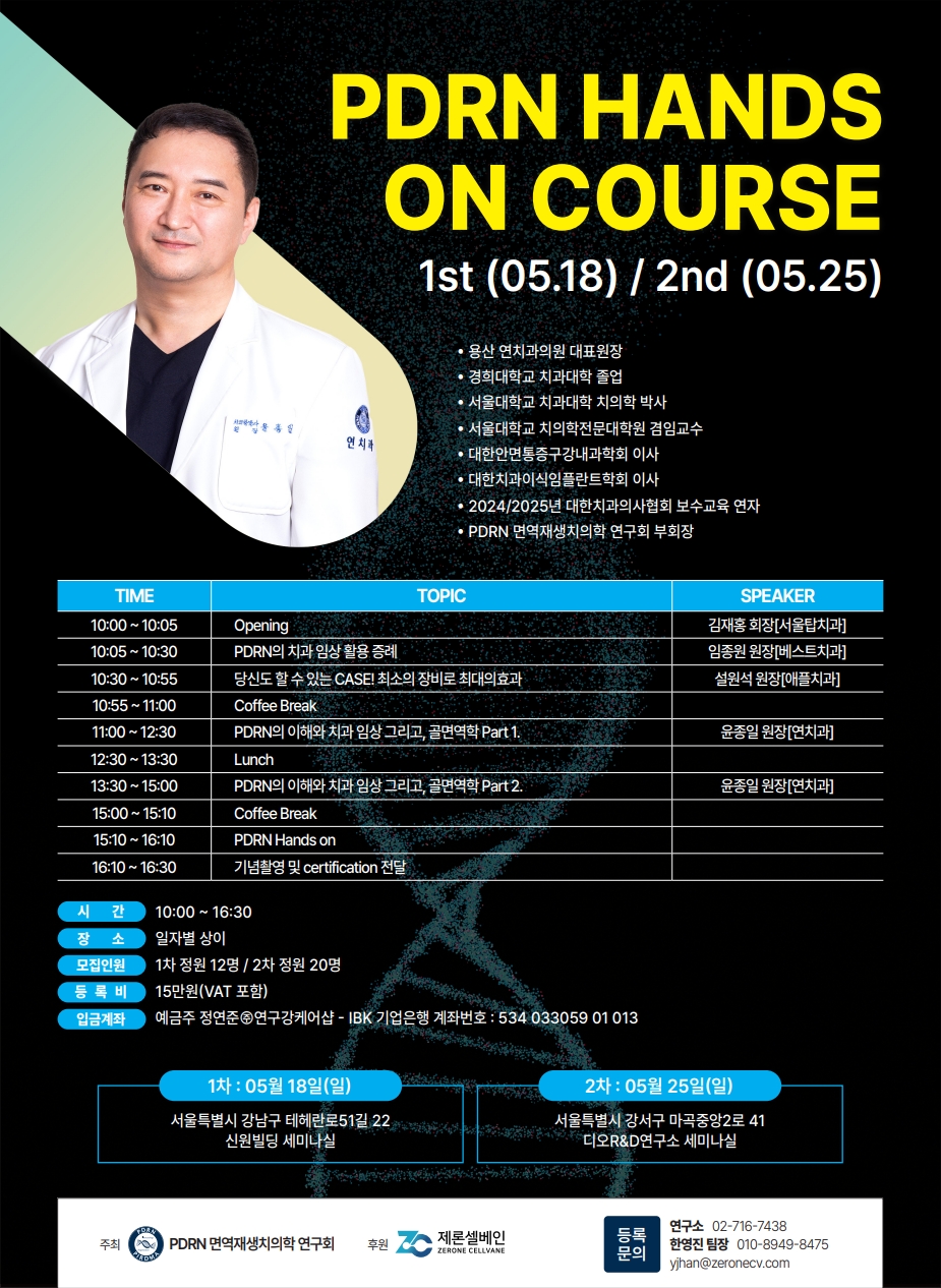제론셀베인(대표 김덕규)은 내달 18일과 25일 신원빌딩 세미나실과 디오 R&D연구소 세미나실에서 '2025 PDRN 핸즈온 코스' 세미나를 진행한다고 21일 밝혔다.