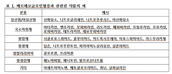 식약처는 "글루코스-6-인산탈수효소 결핍증, 선천성 또는 특발성 메트헤모글로빈혈증, 심장 또는 폐손상 환자, 6개월 미만의 영아, 산화제 또는 이들 약물의 대사체 동시 노출 환자는 메트헤모글로빈혈증 임상증상 발생에 더 민감하다"고 강조했다.