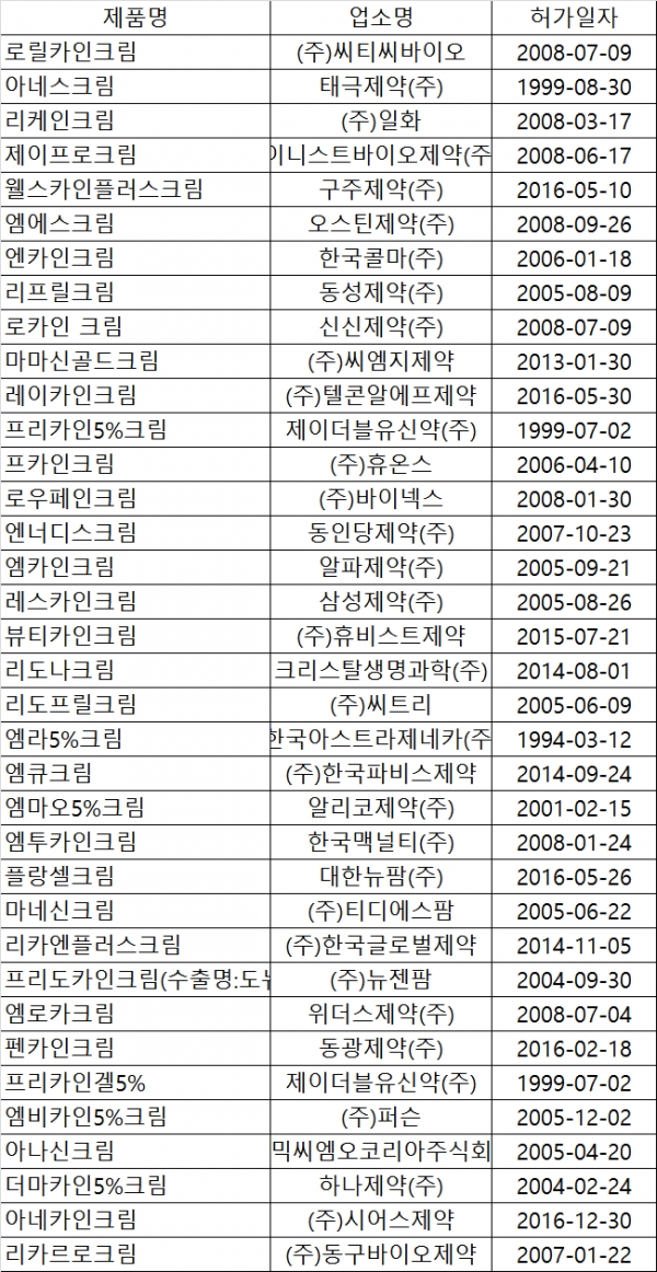 식약처는 메트헤모글로빈혈증 부작용 사례가 발생한 리도카인·프릴로카인 복합제 36개사 36품목을 공지했다.