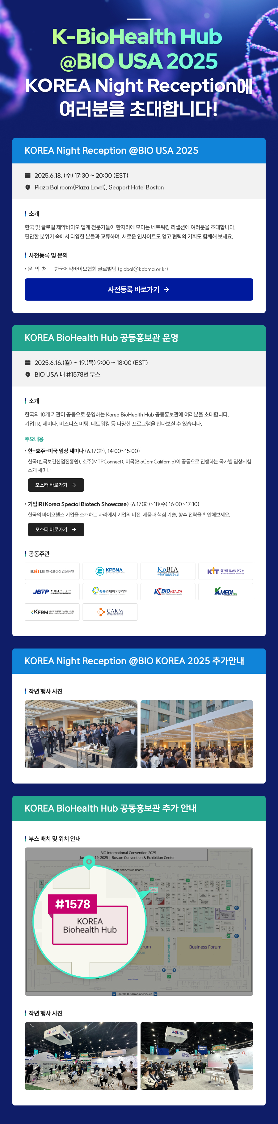 행사 셋째 날인 18일에는 ‘한국의 밤 리셉션(Korea Night Reception)’이 씨포트 호텔 보스턴(Seaport Hotel Boston)에서 개최된다. 한국제약바이오협회, 보산진 등 유관기관이 3년째 바이오USA 기간 중 개최해온 본 리셉션은 매년 약 700여명의 업계 관계자가 참석하는 등 뜨거운 관심을 받으며 대표적인 ‘원 코리아(One Korea)’ 기업 교류 행사로 자리매김했다.