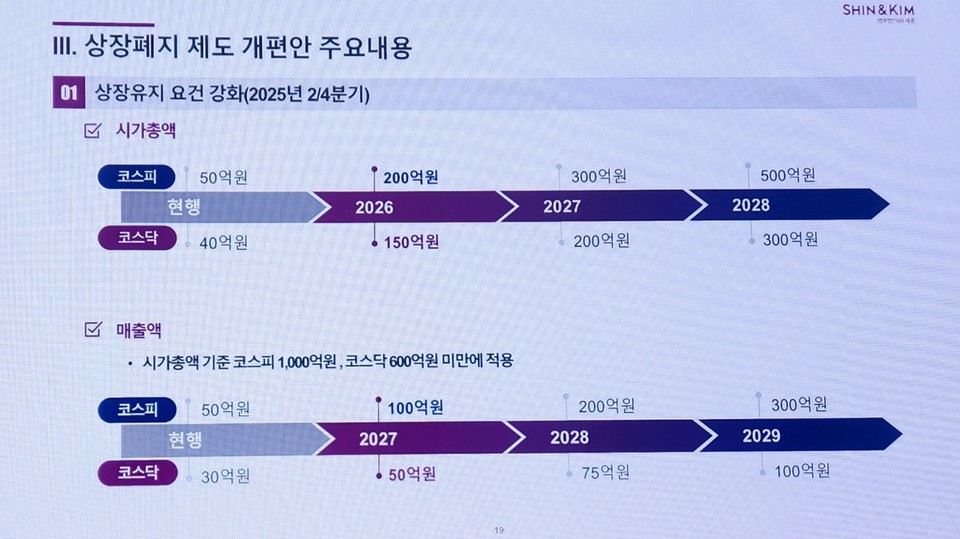 가장 눈에 띄는 변화는 시가총액과 매출액 요건의 단계적 상향 조정이다. 코스피의 시가총액 기준은 2026년까지 200억원으로 상향되며, 이후 500억원까지 확대된다. 코스닥은 150억원에서 시작해 300억원까지 높아진다. 매출액 요건도 코스피는 300억원, 코스닥은 100억원 수준으로 상향된다.