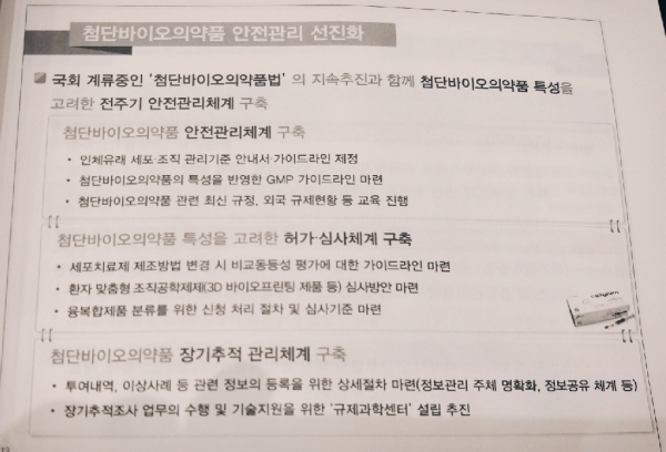오 연구관은 첨단바이오의약품에 대한 맞춤형 허가심사체계 구축을 위해 "첨단바이오의약품 신속처리제도의 세부절차와 조건부허가 운영지침을 마련하겠다"고 설명했다.