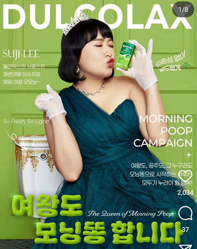 실제로 사노피-아벤티스 코리아(2021년 컨슈머 헬스케어 사업부 오펠라헬스케어코리아로 독립)는 2023년 5월 변비 치료제 둘코락스의 브랜드 앰버서더로 개그우먼 이수지를 발탁했다.