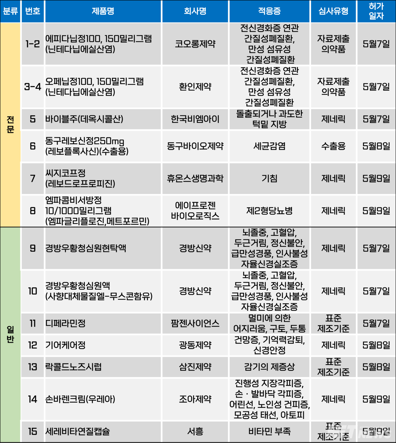 지난주(5월 5~9일) 총 15개 품목이 식품의약품안전처에서 품목허가를 받았다. 전문의약품 8개, 일반의약품 7개 품목이다. 이들은 간질성폐질환, 과도하거나 돌출된 턱밑 지방, 제2형당뇨병, 기침 등 적응증으로 허가됐다.