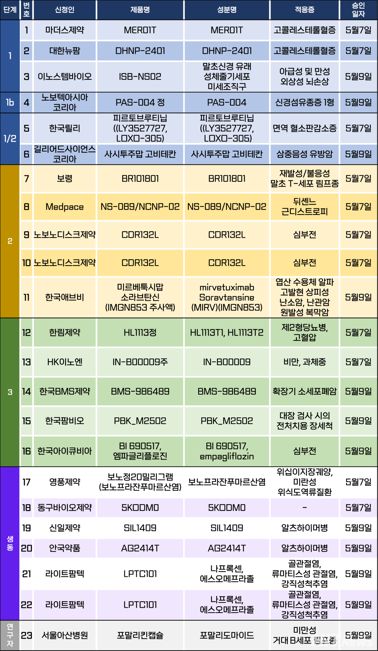 임상시험계획은 총 23건이 승인됐다. 세부적으로 △1상 3건 △1b상 1건 △1/2상 2건 △2상 5건 △3상 5건 △생물학적 동등성 6건 △연구자임상 1건 등이다. 이 임상시험들은 고콜레스테롤혈증, 외상성 뇌손상, 면역 혈소판 감소증, 심부전, 제2형당뇨병, 고혈압, 비만 등 질환을 대상으로 승인됐다.