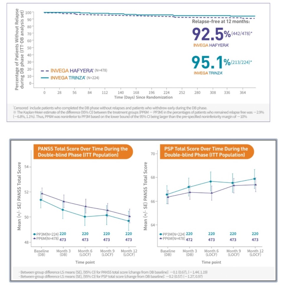 이는 95.1%를 기록한 인베가트린자와 유사한 수치이며, 두 약물의 2차 평가지표인 양성ㆍ음성 증후군 평가지표(PANSS)와 사회적 수행 척도(PSP) 점수의 기준점 대비 변화도 비슷했다.