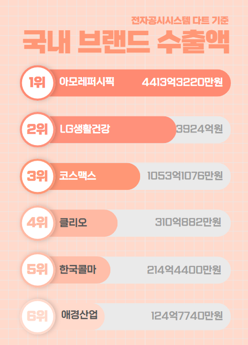 국내 기업 중 수출액 1위를 차지한 기업은 아모레퍼시픽이다. 아모레퍼시픽은 설화수·헤라·아이오페·라네즈 등 브랜드를 통해 제품을 판매하고 있다. 전자공시시스템 다트 기준 아모레퍼시픽의 지난 1분기 총매출액은 9594억2000만원으로, 해외 매출 비율이 46%로 공시돼 약 4413억3320만원 규모로 추정된다.
