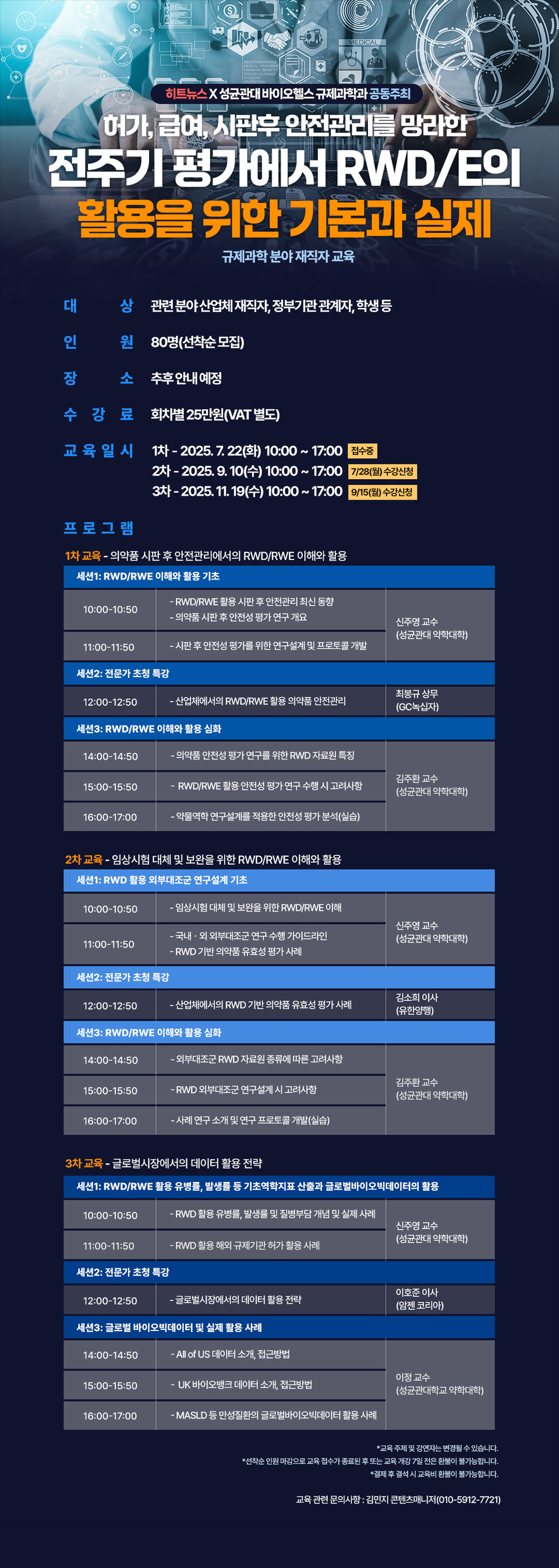 히트뉴스와 성균관대학교 바이오헬스 규제과학과(학과장 신주영)는 오는 7월부터 9월까지 3차에 걸쳐 서울대학교치과병원 지하 1층 남촌강의실에서 '허가, 급여, 시판 후 안전관리 등 전주기 평가에서 RWD/RWE 활용을 위한 기본과 실제'를 주제로 규제과학 분야 재직자 대상 전문 교육을 공동 주최한다.