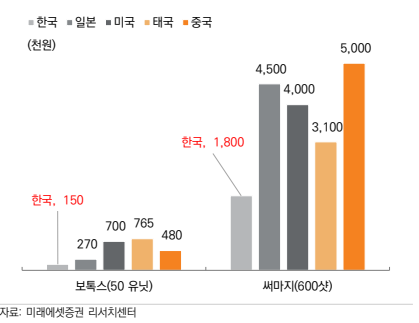 이에 관해 애널리스트가 뽑은 이유는 저렴한 가격과 의사의 시술이다. 글로벌 기업의 보톡스 시술은 최소 70만원 대인데, 국내에서는 10만원 대에 저렴하게 이용할 수 있다는 분석이다. 실제 앨러간 에스테틱스의 타 국가 보톡스 시술가는 76만원 정도인데 국내 시술가는 약 15만원으로 나타났고, 고주파(RF) 장비 써마지 가격도 국내에서 가장 낮게 형성된 것으로 알려졌다.