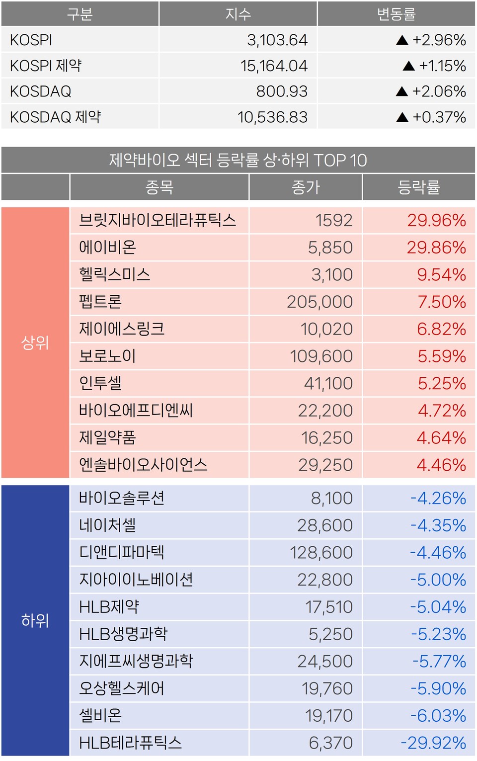 국내 바이오기업 주가가 상반된 흐름을 보였다. 항암 항체신약의 기술이전 성과를 발표한 에이비온은 상한가를 기록한 반면, 안과질환 치료제 임상에서 통계적 유의성을 확보하지 못한 HLB테라퓨틱스는 급락했다.