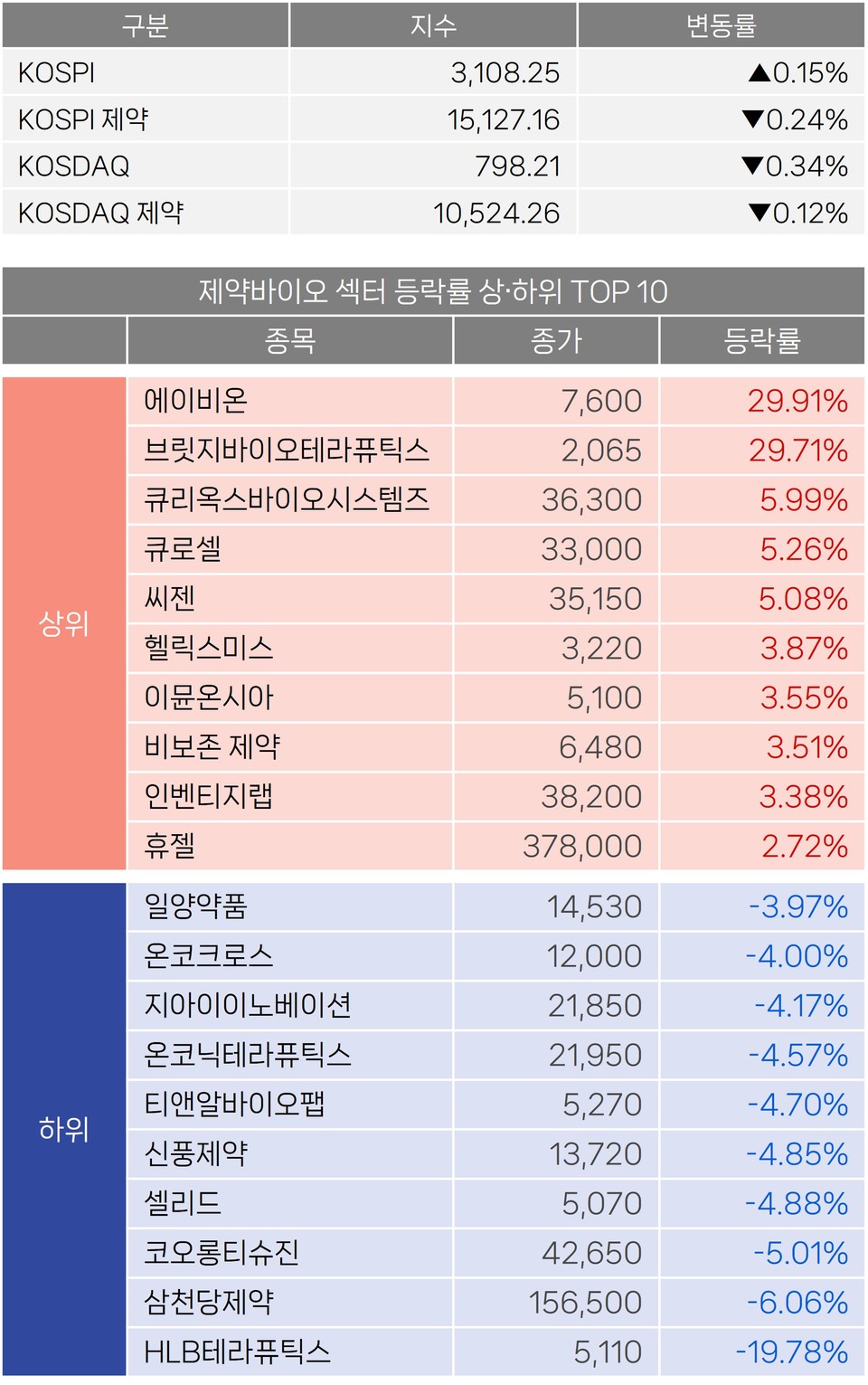 한편, 1조8000억원 규모의 항암 항체 'ABN501'를 기술이전한 '에이비온'은 이틀 연속 상한가 마감했다. 반면 NK 치료제의 유럽 임상3상 실패 소식이 전해진 'HLB테라퓨틱스'는 19.78% 하락했다.