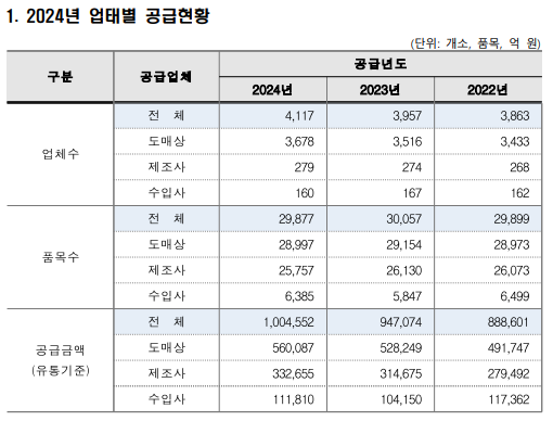 통계집에 따르면, 2024년 전체 의약품 유통금액은 100조5000억원으로 전년 대비 약 6.1%(5조7000억원) 증가했으며, 2022년 88조9000억원에서 최근 3년간 꾸준히 증가하는 추세를 보였다.
