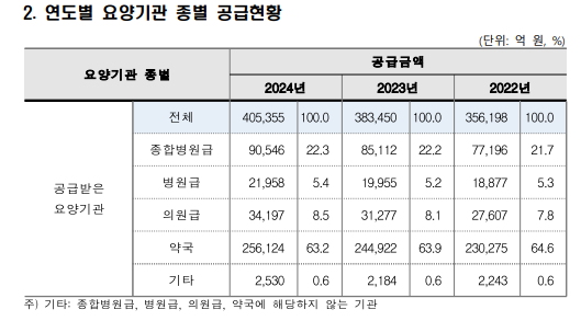 요양기관 종별로 보면 약국이 25조6000억원(63.2%)으로 가장 많았고, 종합병원급 9조1000억원(22.3%), 의원급 3조4000억원(8.5%), 병원급 2조2000억원(5.4%), 기타 2000억원(0.6%) 순으로 나타났다.