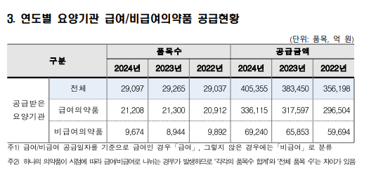 의약품 유통금액 중 요양기관 공급은 40조5000억원으로 전년 대비 5.7%(2조2000억원) 증가했으며, 이 중 급여의약품이 33조6000억원으로 82.9%를 차지했다.