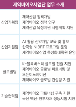 [끝까지 HIT 14호] 사업단은 4개 팀(산업기획팀, 산업지원팀, 글로벌팀, 기술협력팀)으로 구성됐다. 먼저 산업기획팀은 보건복지부의 제약산업 육성 지원을 위한 중장기 계획 수립을 돕고, 시행 계획에 따라 적합한 지원을 제공한다. 산업계와 전문가 의견을 취합해 미충족 수요를 발굴한다. 산업지원팀은 정부 지원 사업과 인공지능(AI) 관련 인력 양성을 맡았다. 여기에 인프라 구축을 위한 정보 제공으로 교육 프로그램 등 관련 지원 사업을 진행한다. 글로벌팀은 국내 기업이 해외 판로를 개척할 수 있도록 현지 거점 마련·입주·전시회를 통한 글로벌 파트너 모색·컨설팅 등의 지원을, 기술 협력팀은 산업 생산 기술이나 새로운 신기술에 관한 협력을 돕는다.
