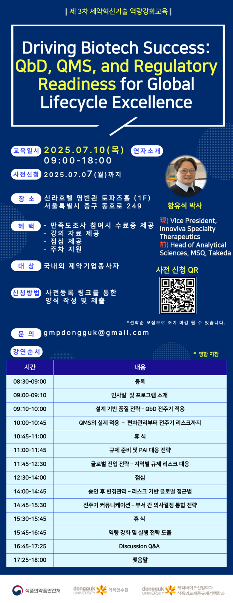 이번 교육은 식품의약품안전처 지원 사업의 일환으로, 동국대학교 권경희 교수(약학연수원 원장, 식품·의료제품규제정책학과 및 제약바이오산업학과 학과장)가 총괄 책임을 맡아 진행된다.