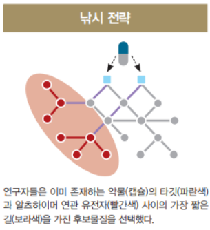 네트워크 기반 분석은 ‘마이크로어레이 유전자 발현’ 데이터를 이용해 유전체 간의 상호관계를 분석하며 어떤 유전체들이 서로 연결돼 있는지 통계학적으로 추론하는 것이다. 연구팀은 시판받아 사용 중인 약(캡슐)의 타깃(푸른색)과 알츠하이머 유전자(붉은색) 사이에 가장 짧은 구간(보라색)을 가진 후보물질을 선택하는 ‘낚시 전략ʼ을 사용했다(오른쪽 그림).
