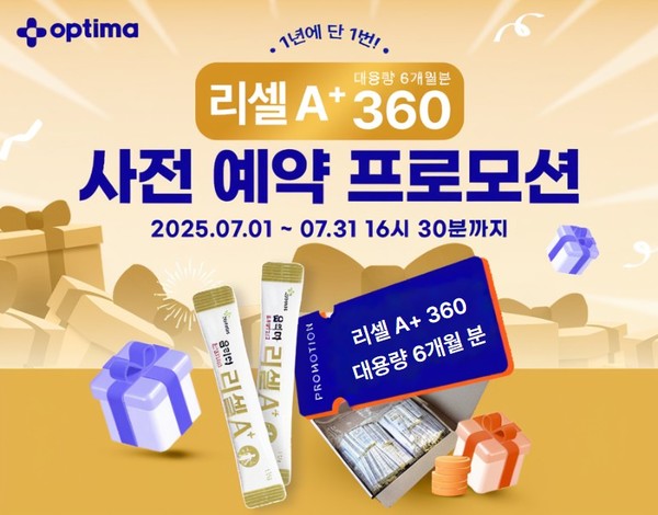 약국체인 옵티마(대표 김진호)가 대표 건강기능식품 ‘리셀 A+’의 대용량 특별 프로모션을 7월 한 달간 단독 진행한다고 11일 밝혔다. 프로모션은 매년 단 한 번만 진행된다.