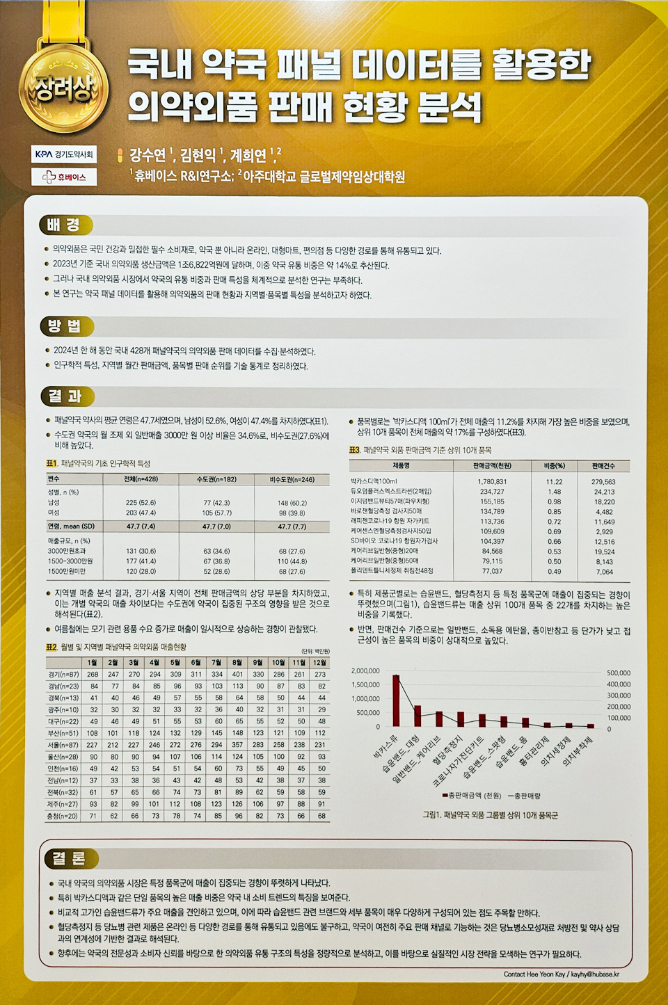 휴베이스(대표 김현익)는 R&I연구소가 수행한 '국내 약국 패널 데이터를 활용한 의약외품 판매 현황 분석' 연구가 제20회 경기도약사회 학술제 포스터 부문에서 장려상을 수상했다고 밝혔다.