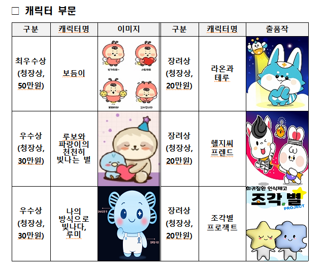 최우수상으로는 슬로건 부문에 '희망을 잇는 귀한 관심, 함께 이겨내는 희귀질환'이, 캐릭터 부문에는 반딧불이를 형상화한 '보듬이'가 뽑혔다.