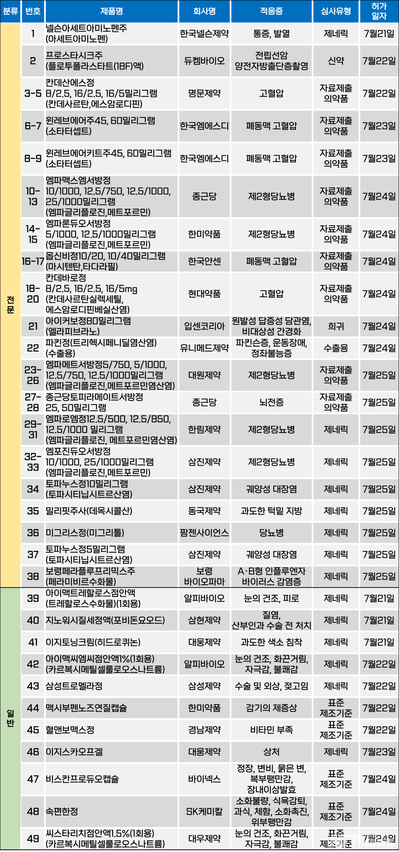 지난주(7월21~25일) 총 49개 품목이 식품의약품안전처에서 품목허가를 받았다. 전문의약품 38개, 일반의약품 11개 품목이다. 이들은 고혈압, 제2형당뇨병, 파킨슨증, 뇌전증, 궤양성 대장염, 원발성 담즙성 담관염 등 적응증으로 허가됐다.