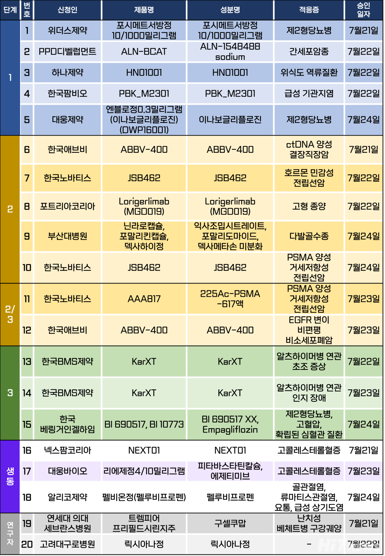 임상시험계획은 총 20건이 승인됐다. 세부적으로 △1상 5건 △2상 6건 △2/3상 2건 △3상 3건 △생물학적 동등성 3건 △연구자 임상 2건 등이다. 이 임상시험들은 제2형당뇨병, 위식도 역류질환, 고혈압 등 질환과 간세포암, 결장직장암, 전립선암, 다발골수종, 비소세포폐암 등 암종을 대상으로 승인됐다.