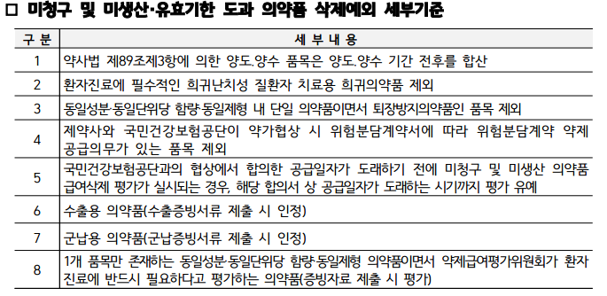 최근 2~3년새 미생산 또는 미청구 의약품의 평가가 진행된다. 급여삭제 통보 시 10월~11월 급여목록에서 삭제될 것으로 보인다.