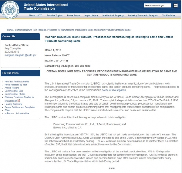메디톡스(대표 정현호)는 앨러간과 함께 미국 국제무역위원회(ITC)에 제소한 대웅제약 및 에볼루스의 불공정 행위에 대해 ITC가 지난 1일(현지시간) 공식 조사에 착수했다고 4일 밝혔다.
