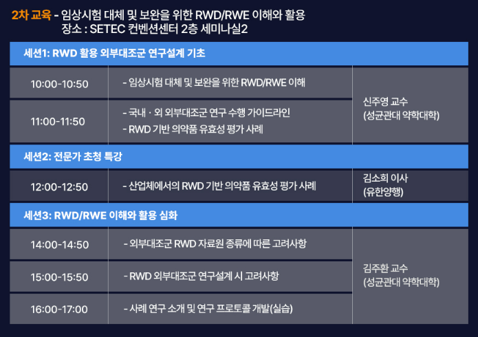 이번 교육은 '임상시험 대체 및 보완을 위한 RWD/RWE 이해와 활용'을 주제로 개최되며, 임상 연구자에게 필요한 RWD/RWE 이론과 실제를 △RWD 활용 외부대조군 연구설계 기초 △전문가 초청 특강 △RWD/RWE 이해와 활용 심화 등 3개 세션으로 구성했다.