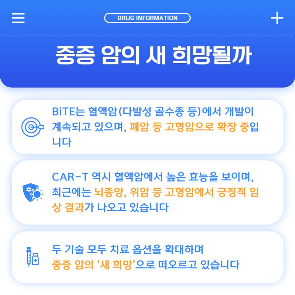 이번 카드뉴스에서 BiTE와 CAR-T의 작동 원리와 실제 적용 사례를 살펴본다.